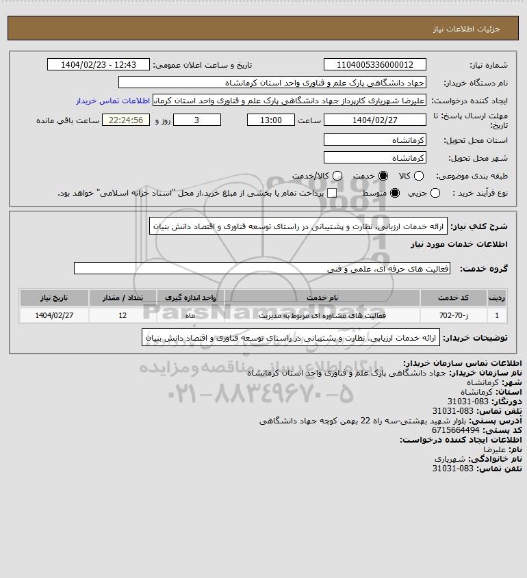 توضیحات خریدار:ارائه خدمات ارزیابی، نظارت و پشتیبانی در راستای توسعه فناوری و اقتصاد دانش بنیان