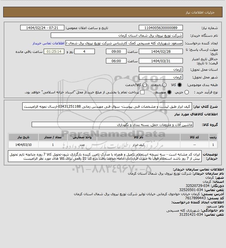 نام دستگاه خریدار:شرکت توزیع نیروی برق شمال استان کرمان