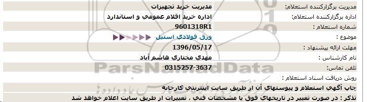 استعلام بها و موضوع استعلام استعلام , استعلام ورق فولادی استیل به اطلاع کلیه شرکتها و افراد متخصص واجد شرایط میرساند، آگهی گذار در نظر دارد از طریق استعلام بها، نسبت به انتخاب و دریافت پیشنهادات اقدام نماید. این استعلام با کد آگهی ثبت شده در سامانه خبرگزاری پارس نماد : 902683 منتشر شده است. مشخصات استعلام : تاریخ شروع استعلام: 1396/05/09 آخرین مهلت ارسال پیشنهاد قیمت : 1396/05/17 و محل اجرای پروژه : استان اصفهان میباشد. استعلام قیمت مورد درخواست : استعلام , استعلام ورق فولادی استیل با دستهبندیهای تخصصی و گروه های مرتبط : آهن آلات, انواع ورق, استعلام اطلاع رسانی میگردد.