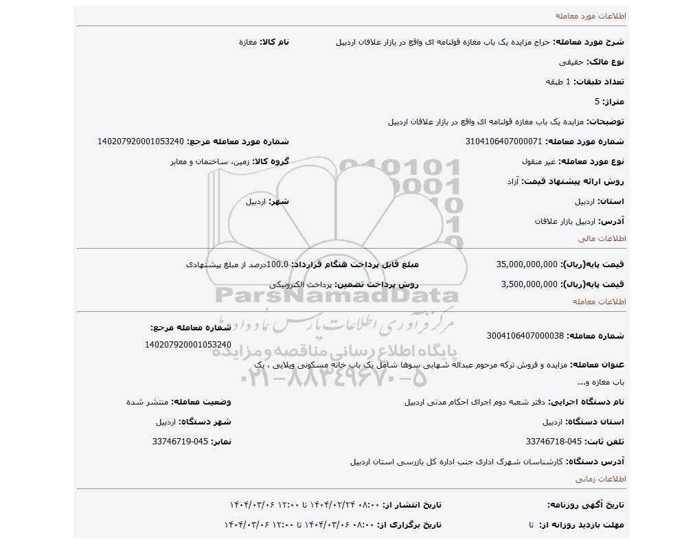 شرح مورد معامله: حراج مزایده یک باب مغازه قولنامه ای واقع در بازار علافان اردبیل | نام کالا: مغازه | |