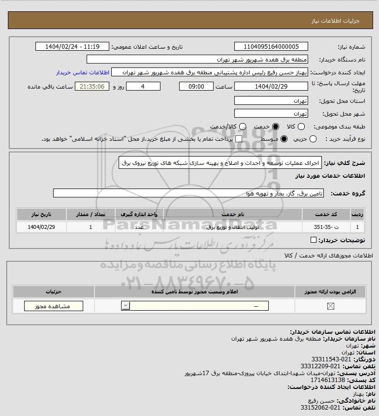 شرح کلی نیاز: اجرای عملیات توسعه و احداث و اصلاح و بهینه سازی شبکه های توزیع نیروی برق