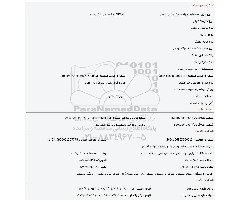 | شرح مورد معامله: حراج فروش زمین زراعی | نام کالا: قطعه زمین کشاورزی | |