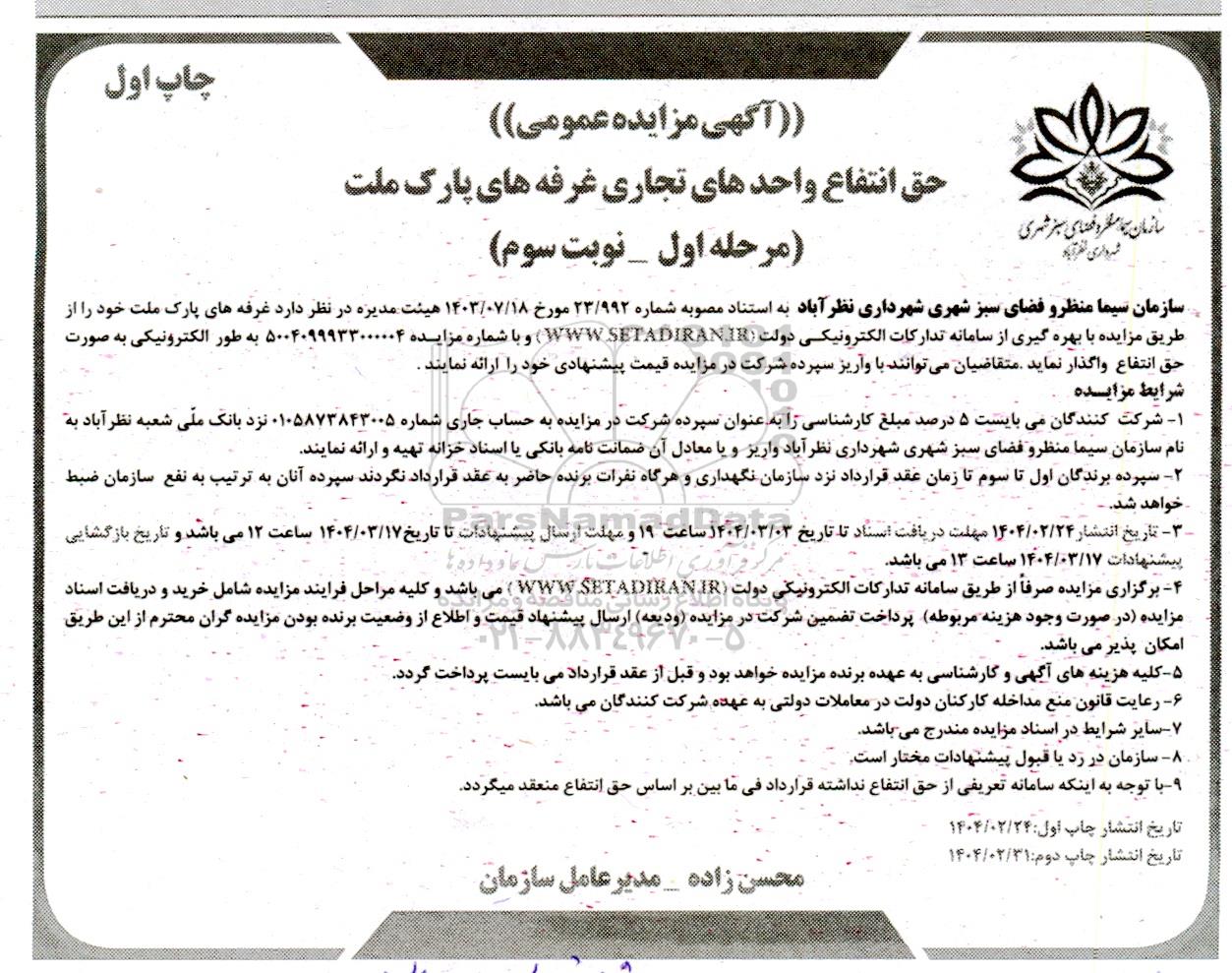 آگهی مزایده عمومی حق انتفاع واحدهای تجاری غرفه های پارک ملت ؟ چاپ اول (مرحله اول - نوبت سوم)
