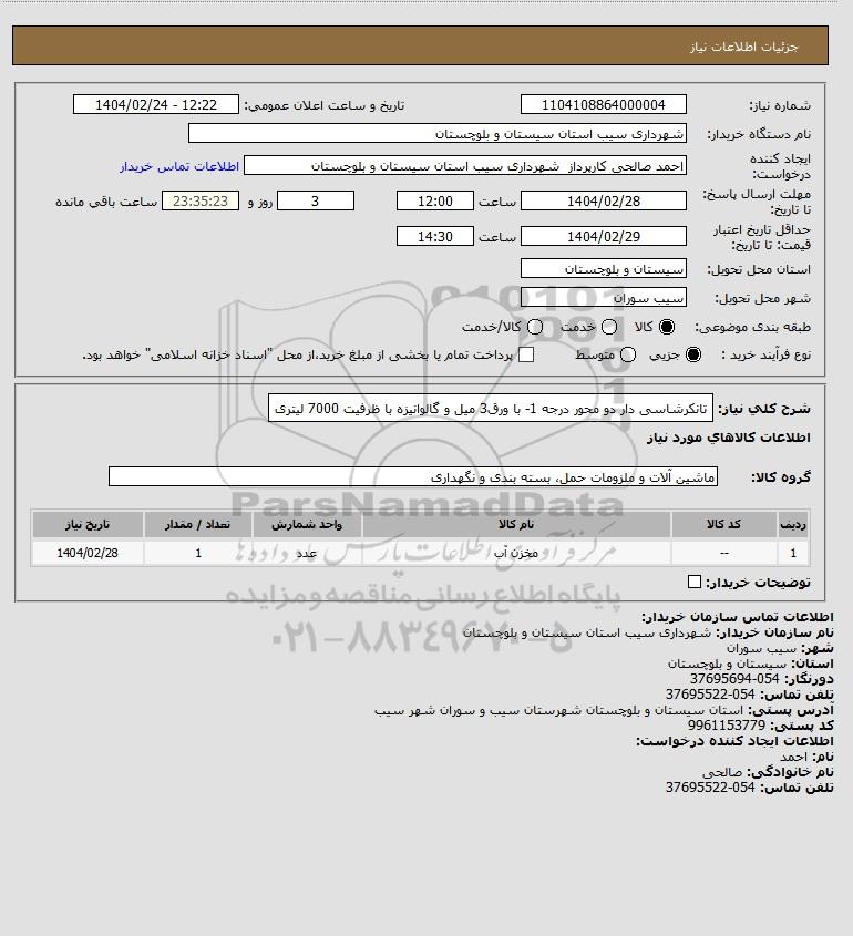 شرح کلی نیاز: تانکرشاسی دار دو محور درجه 1- با ورق3 میل و گالوانیزه با ظرفیت 7000 لیتری