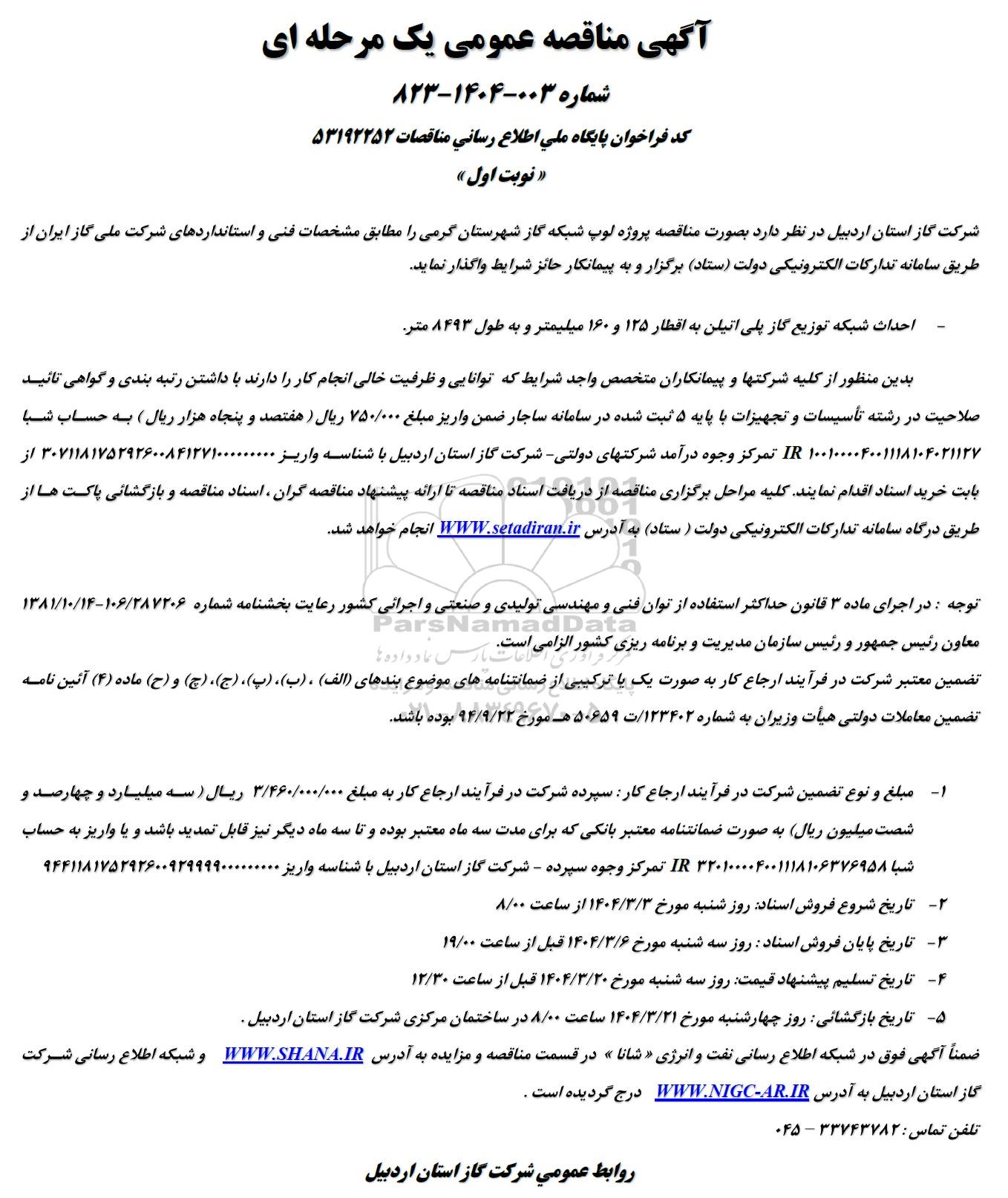 ضمناً آگهی فوق در شبکه اطلاع رسانی نفت و انرژی شانا» در قسمت مناقصه و مزایده به آدرس WWW.SHANA.IR و شبکه اطلاع رسانی شرکت گاز استان اردبیل به آدرس WWW.NIGC-AR.IR درج گردیده است .
