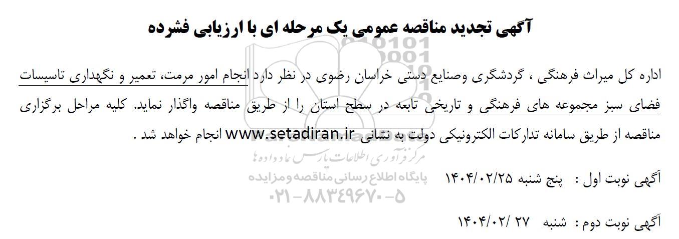 اداره کل میراث فرهنگی، گردشگری و صنایع دستی خراسان رضوی در نظر دارد اجام امور مرمت، تعمیر و نگهداری تاسیسات فضای سبز مجموعه های فرهنگی و تاریخی تابعه در سطح استان را از طریق مناقصه وگذار نماید. کلیه مراحل برگزاری مناقصه از طریق سامانه تدارکات الکترونیکی دولت انجام خواهد شد.