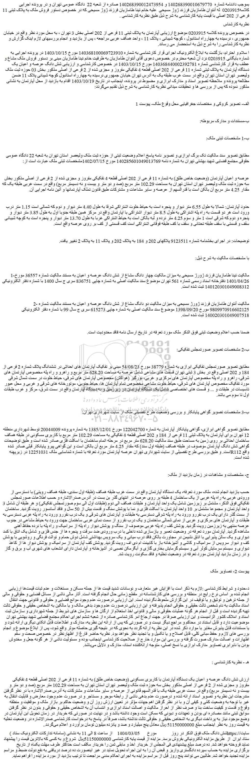 ا سلام و احترام، بازگشت به ابلاغ الکترونیک اجرای قرار کارشناسی به شماره 140368100069723910 مورخ 1403/10/15 در پرونده اجرایی به شماره بایگانی 0203915 نزد آن شعبه محترم در خصوص دعوی آقای آنتوان طامازیان به طرفیت خانم تینا طامازیان مبنی بر دستور فروش ملک مشاع و عطف به قرار کارشناسی شماره 140368440002392781 مورخ 1403/10/15 در خصوص کارشناسی و ارزیابی شش دانگ عرصه و اعیان یک دستگاه آپارتمان به پلاک ثبتی شماره 11 فرعی از 202 اصلی قطعه 4 تفکیکی مفروز و مجزی شده از 2 فرعی از اصلی مذکور بخش 03 حوزه ثبت ملک ولیعصر تهران استان تهران واقع در سمت غرب طبقه یک به آدرس تهران خیابان جمهوری نرسیده به چهارراه استانبول کوچه شیبانی پلاک 11 ضمن مطالعه پرونده و ملاحظه تصویر اسناد و مدارک ابرازی و مضبوط در پرونده، اینجانب در تاریخ 1403/10/19 اقدام به بازدید از محل آپارتمان به نشانی مذکور نموده که پس از بررسی ها و تحقیقات میدانی نظریه کارشناسی به شرح ذیل تقدیم می گردد: