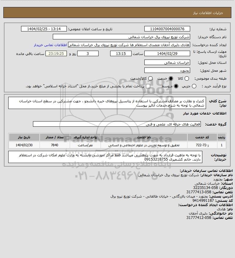 شرح کلی نیاز: کنترل و نظارت بر مصارف مشترکین با استفاده از پتانسیل نیروهای خبره دانشجو ، جهت مشترکین در سطح استان خراسان شمالی با توجه به شرح خدمات آنالیز پیوست