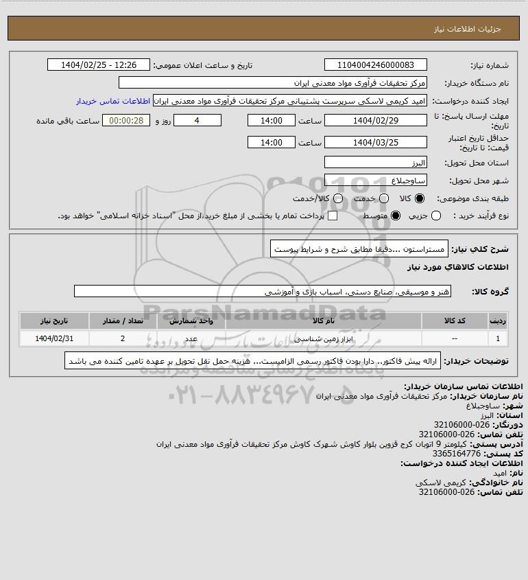استعلام بها و موضوع استعلام استعلام مستراستون ...دقیقا مطابق شرح و شرایط پیوست به اطلاع کلیه شرکت‌ها و افراد متخصص واجد شرایط می‌رساند، آگهی گذار در نظر دارد از طریق استعلام بها، نسبت به انتخاب و دریافت پیشنهادات اقدام نماید. این استعلام با کد آگهی ثبت شده در سامانه خبرگزاری پارس نماد : 9034179 منتشر شده است. مشخصات استعلام : تاریخ شروع استعلام: 1404/02/25 آخرین مهلت ارسال پیشنهاد قیمت : 1404/02/29 و محل اجرای پروژه : استان البرز میباشد. استعلام قیمت مورد درخواست : استعلام مستراستون ...دقیقا مطابق شرح و شرایط پیوست با دسته‌بندی‌های تخصصی و گروه های مرتبط : ابزار دقیق, خدمات و تجهیزات آزمایشگاهی و پزشکی, زمین شناسی, استعلام اطلاع رسانی میگردد.