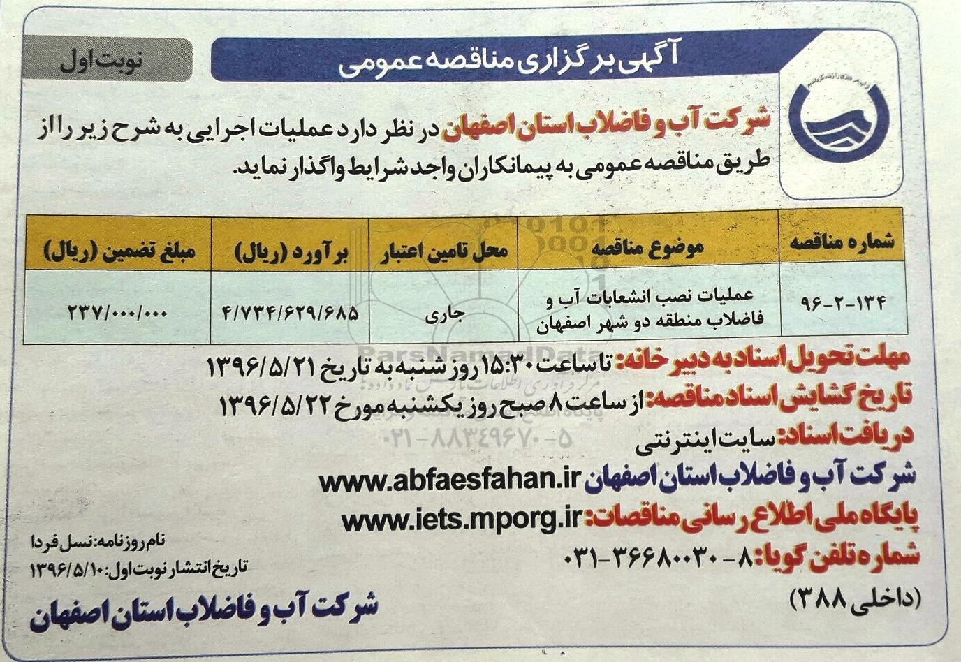 شرکت آب و فاضلاب استان اصفهان در نظر دارد عملیات اجرایی به شرح زیر را از طریق مناقصه عمومی به پیمانکاران واجد شرایط واگذار نماید .