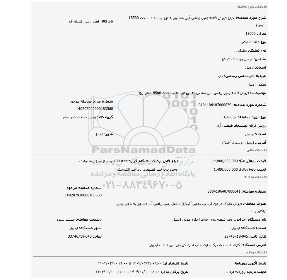 مزایده عمومی مزایده فروش قطعه زمین زراعی آبی مشهور به اوچ ایپ به مساحت 18500 مترمربع برگزار میگردد. از کلیه افراد متخصص و شرکتهای واجد شرایط دعوت به عمل میآید تا در این مزایده با کد خبرگزاری پارس نماد : 9035853 شرکت نمایند تاریخ شروع مزایده : 1404/02/27 مهلت شرکت در مزایده: تا پایان روز 1404/03/10