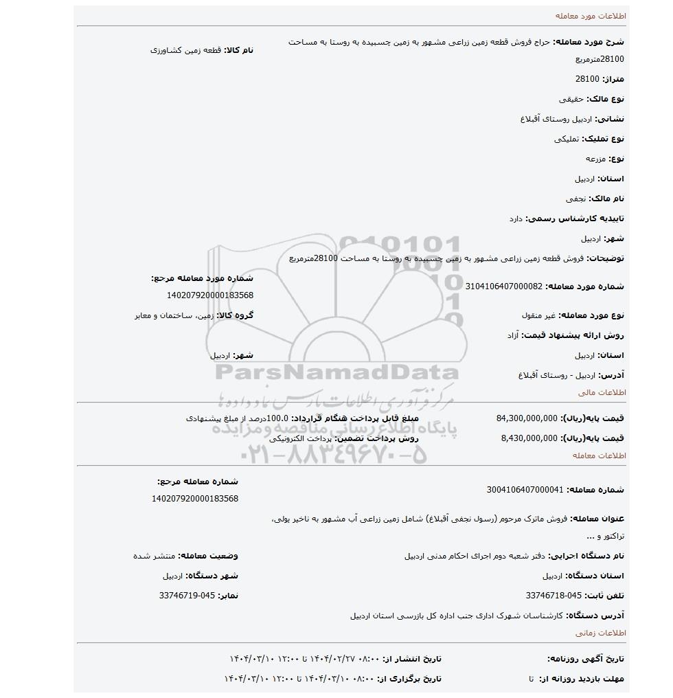 عنوان معامله: فروش ماترک مرحوم (رسول نجفی آقبلاغ) شامل زمین زراعی آب مشهور به ناخیر یولی، تراکتور و ... | ||
