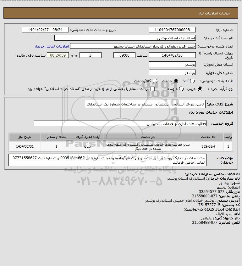 شرح کلی نیاز: تامین نیروی انسانی و پشتیبانی مستقر در ساختمان شماره یک استانداری