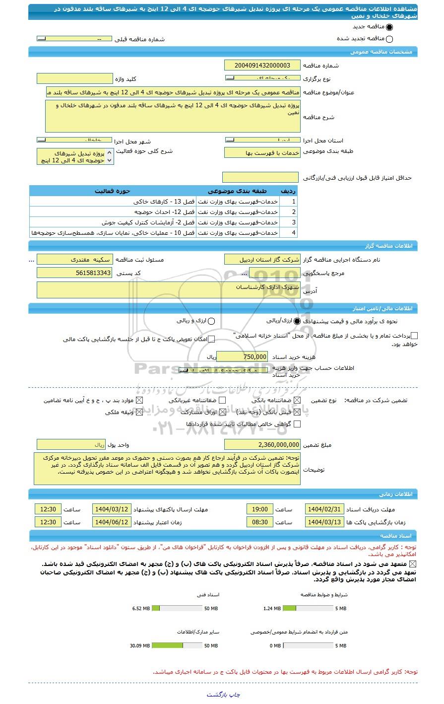 عنوان/موضوع مناقصهمناقصه عمومی یک مرحله ای پروژه تبدیل شیرهای حوضچه ای 4 الی 12 اینچ به شیرهای ساقه بلند مدفون در شهرهای خلخال و نمین