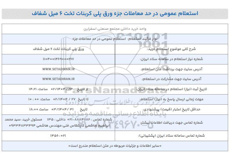 شرح کلی موضوع استعلام خرید: ورق پلی کربنات تخت 6 میل شفاف