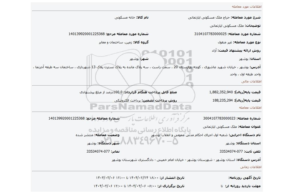 | نام دستگاه اجرایی: شعبه اول اجرای احکام مدنی عمومی و انقلاب بوشهر | وضعیت معامله: منتشر شده | |