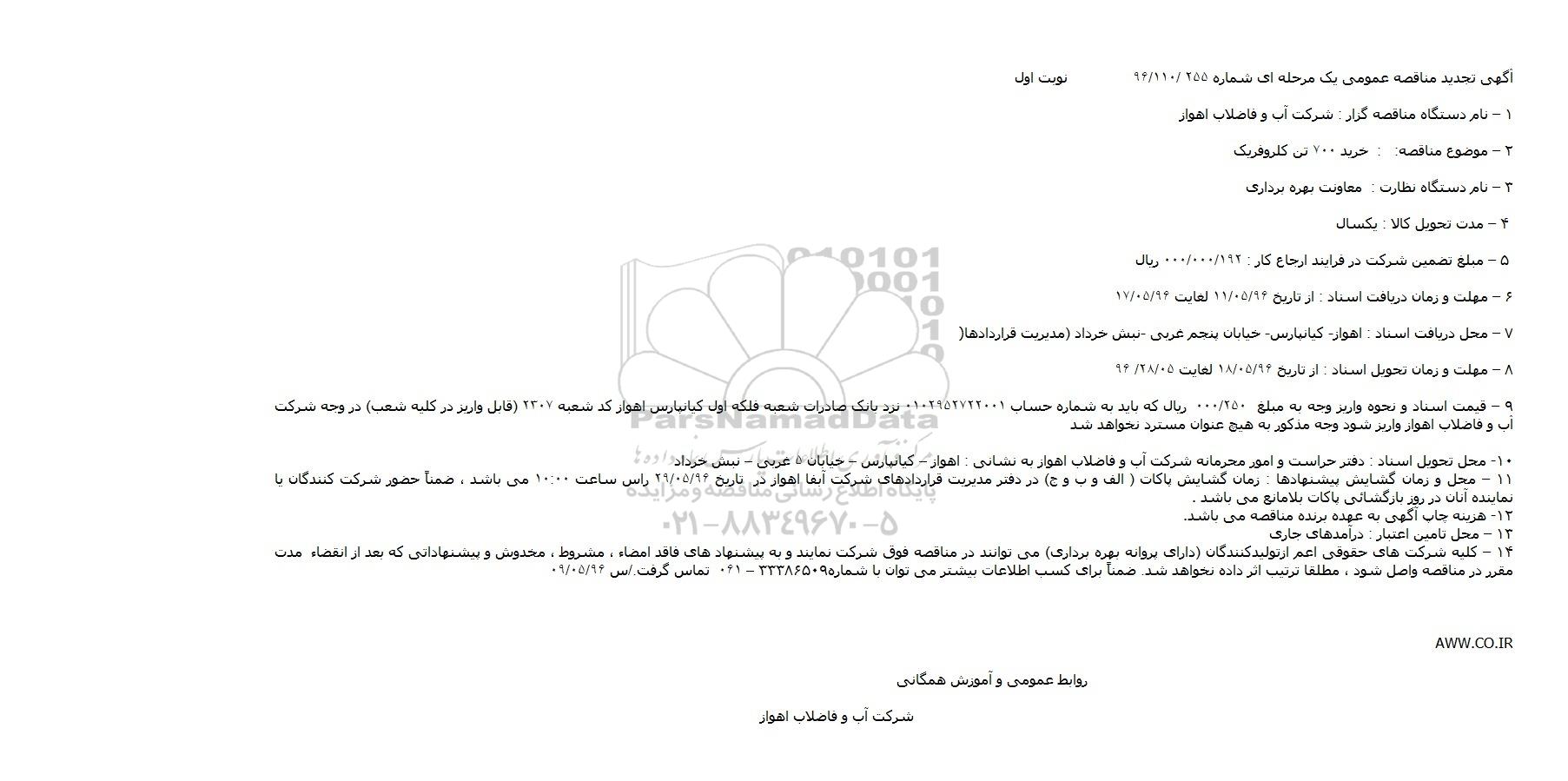 تجدید مناقصه خرید 700 تن کلروفریک از کلیه افراد متخصص و شرکتها واجد شرایط دعوت به عمل میآید در مناقصه با کد خبرگزاری پارس نماد: 903720 شرکت نمایند.