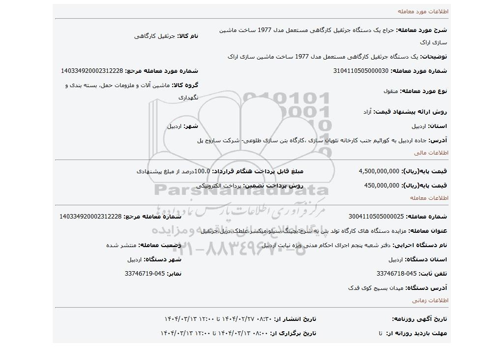 | عنوان معامله: مزایده دستگاه های کارگاه تولد بتن به شرح:بچینگ،سیلو،میکسر،غلطک،دریل،جرثقیل | ||