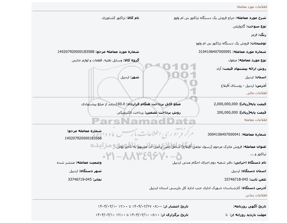 عنوان معامله: فروش ماترک مرحوم (رسول نجفی آقبلاغ) شامل زمین زراعی آب مشهور به ناخیر یولی، تراکتور و ... | ||