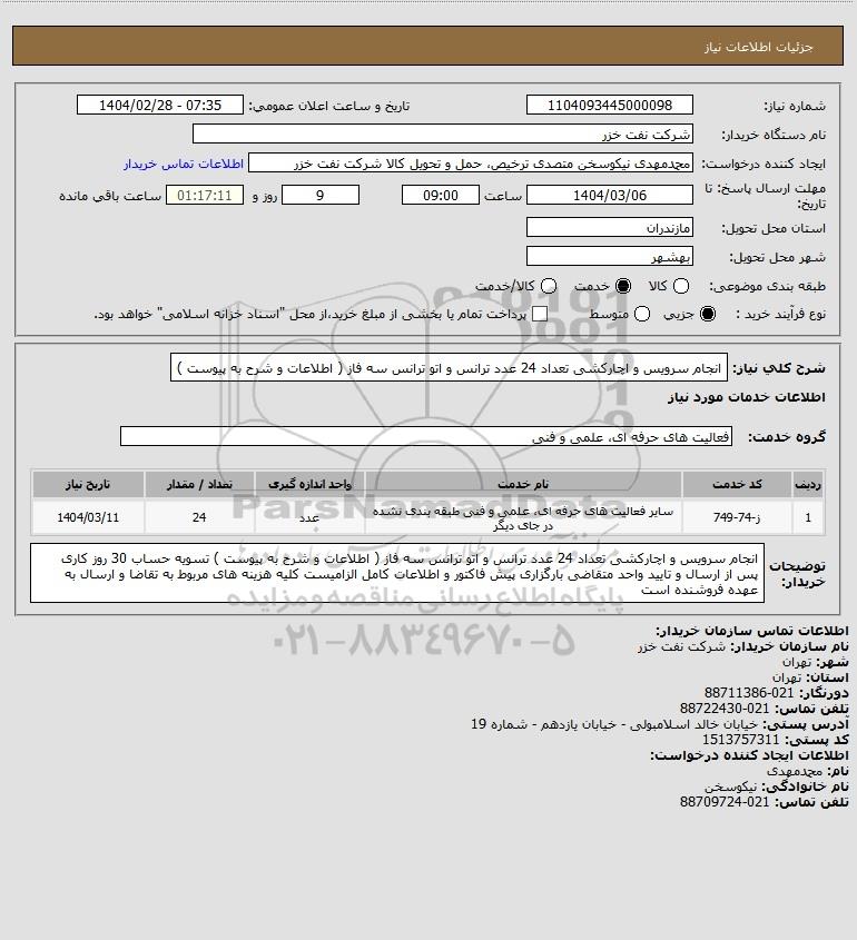 شرح کلی نیاز: انجام سرویس و اچارکشی تعداد 24 عدد ترانس و اتو ترانس سه فاز ( اطلاعات و شرح به پیوست )