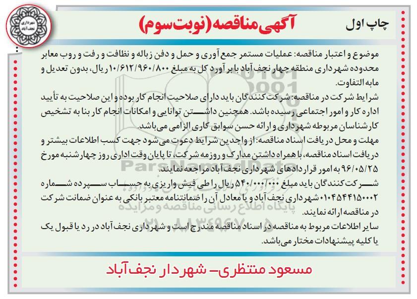 مناقصه عملیات مستمر جمع آوری و حمل و دفن زباله و ... چاپ اول نوبت سوم از کلیه افراد متخصص و شرکتها واجد شرایط دعوت به عمل میآید در مناقصه با کد خبرگزاری پارس نماد: 904299 شرکت نمایند.