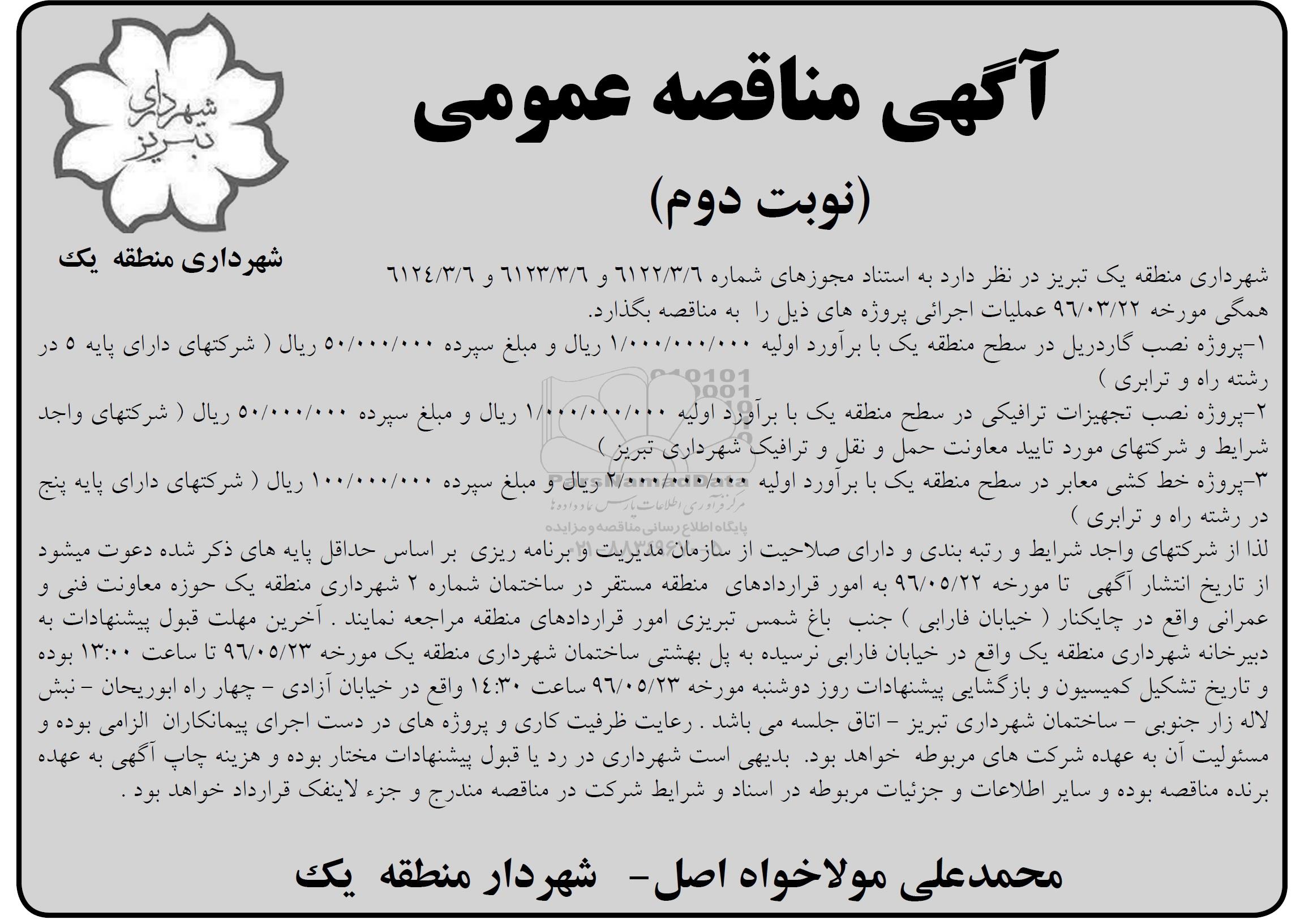 شهرداری منطقه یک تبریز درنظر دارد به استناد مجوزهای شماره 6122/3/6 و 6123/3/6 و 6124/3/6 همگی مورخه 96.3.22 عملیات اجرایی پروژه های ذیل را به مناقصه بگذارد .