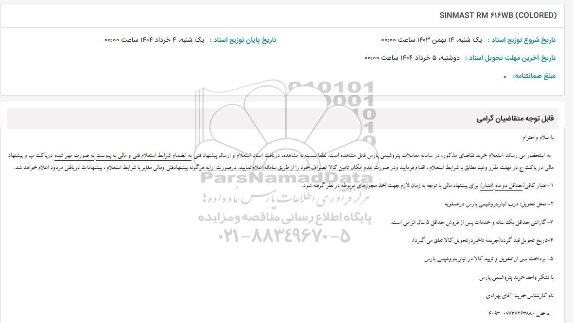 به استحضار می رساند استعلام خرید تقاضای مذکور در سامانه معاملات پتروشیمی پارس قابل مشاهده است. لطفا نسبت به مشاهده دریافت استاد استعلام و ارسال پیشنهاد فنی به انضمام شرایط استلام فی و مالی و پیوست به صورت مهر شد و در پاکت به و پیشنهاد مالی در پاکت ج در مهلت مقرر و عینا مطابق با شرایط استعلام ، اقدام فرمایید و در صورت عدم امکان تامین کالا انصراف محود را از طریق سامانه اعلام نمایید. در صورت ارائه هر گونه پیشنهاد فنی و مالی مغایر با شرایط استعلام ، پیشنهادات دریافتی مردود اعلام خواهد شد.