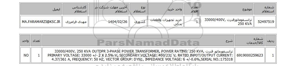 | 52497519 | ترانسفوماتورقدرت 33000/400V, 250 KVA | 1 | خرید تجهیزات وقطعات یدکی | کشوری | 1404/02/26 | مهدی فرامرزی | MA.FARAMARZI@KSC.IR |