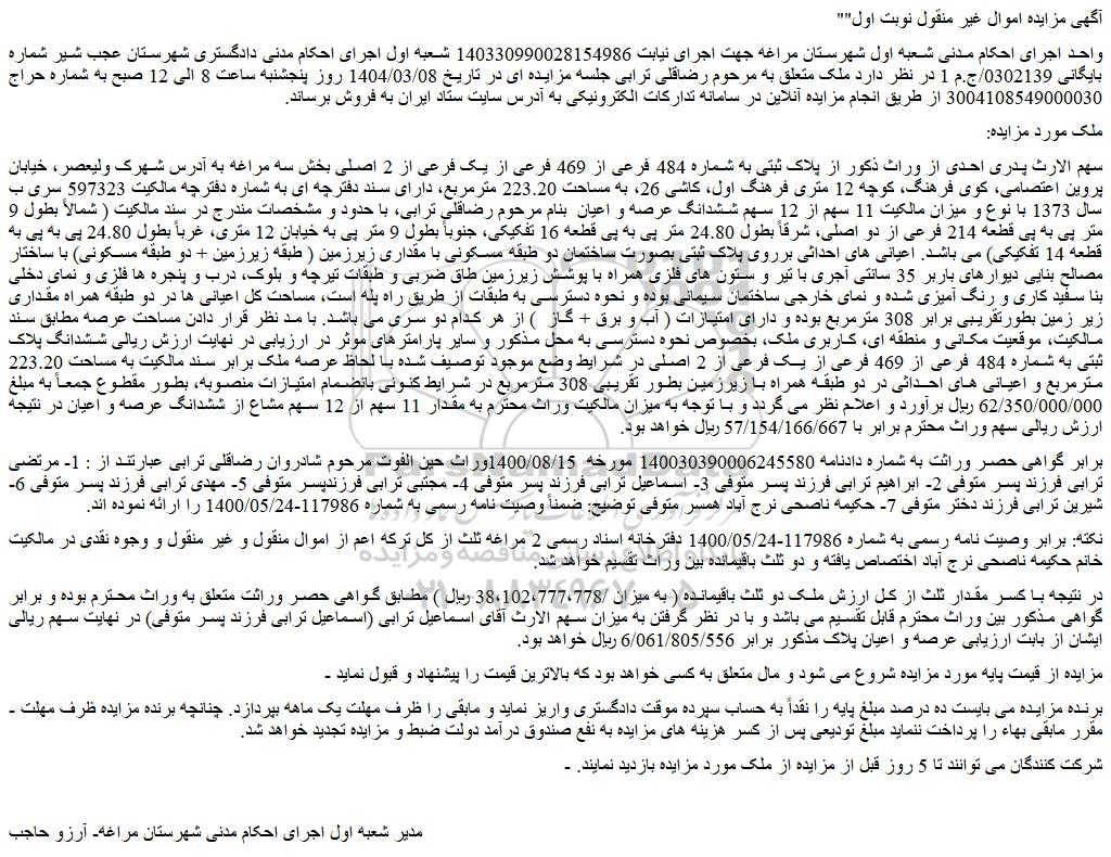 واحد اجرای احکام مدنی شعبه اول شهرستان مراغه جهت اجرای نیابت 140330990028154986 شعبه اول اجرای احکام مدنی دادگستری شهرستان عجب شیر شماره بایگانی 0302139/ج.م 1 در نظر دارد ملک متعلق به مرحوم رضاقلی ترابی جلسه مزایده ای در تاریخ 1404/03/08 روز پنجشنبه ساعت 8 الی 12 صبح به شماره حراج 3004108549000030 از طریق انجام مزایده آنلاین در سامانه تدارکات الکترونیکی به آدرس سایت ستاد ایران به فروش برساند.