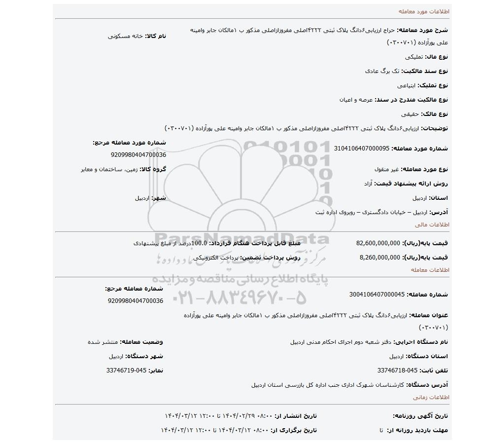 شماره مورد معامله: 3104106407000095 | شماره مورد معامله مرجع: 9209980404700036 | |