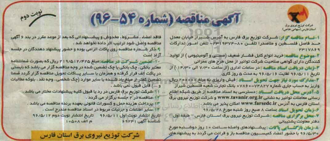 مناقصه خرید انواع کابل فشار ضعیف (مسی و آلومینیومی) نوبت دوم از کلیه افراد متخصص و شرکت‌ها واجد شرایط دعوت به عمل می‌آید در مناقصه با کد خبرگزاری پارس نماد: 904930 شرکت نمایند. این مناقصه در تاریخ 1396/05/12 شروع و مهلت آن تا تاریخ 1396/05/16 میباشد.