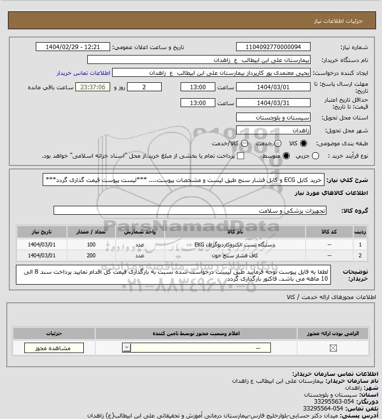 استعلام خرید کابل ECG و کابل فشار سنج طبق لیست و مشخصات پیوست.... ***لیست پیوست قیمت گذاری گردد*** ؟