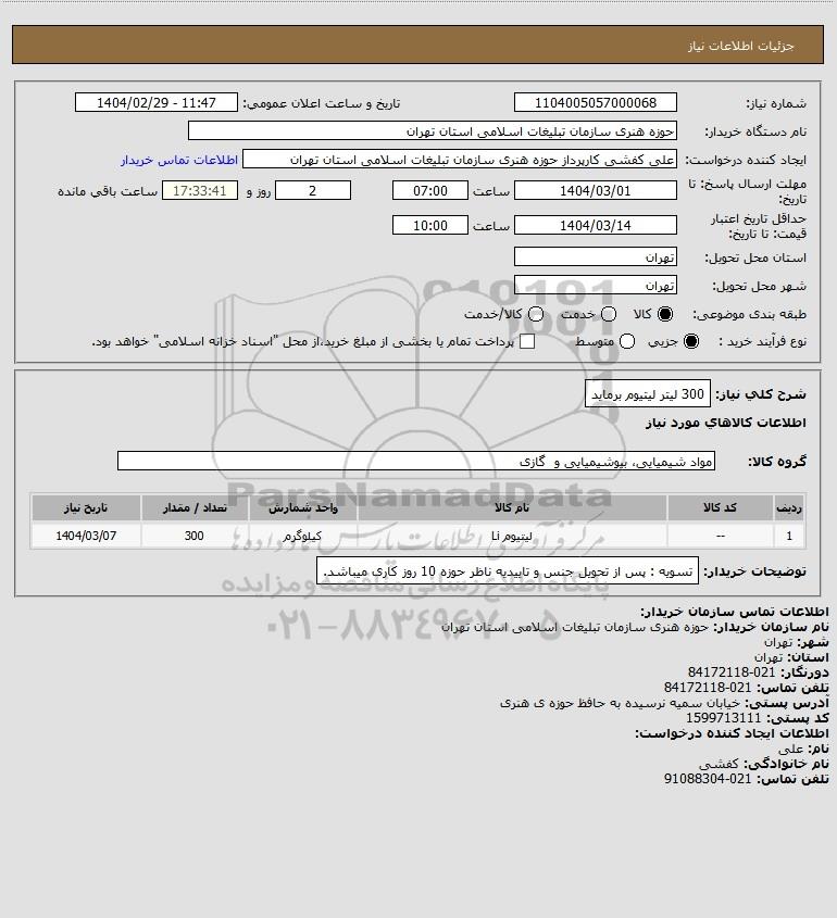 | 1 | -- | لیتیوم Li | کیلوگرم | 300 | 1404/03/07 |
