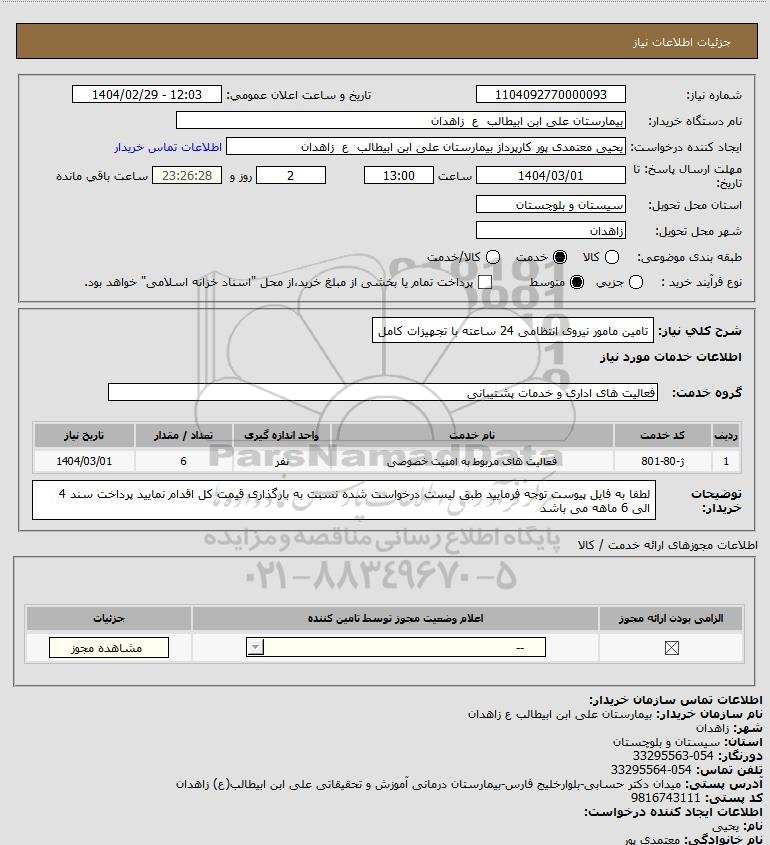 شرح کلی نیاز: تامین مامور نیروی انتظامی 24 ساعته با تجهیزات کامل