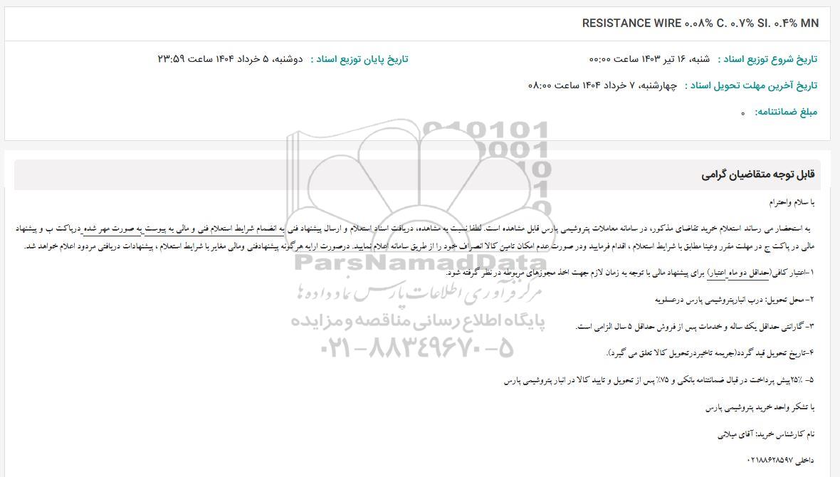 در صورت نیاز به دریافت راهنمایی یا پشتیبانی در خصوص استعلام و مناقصه و فراخوان مناقصه عمومی، مناقصه محدود، مناقصه بین‌ المللی، مناقصه دولتی، مناقصه خصوصی، مناقصه آنلاین فروش تجهیزات، مناقصه مشاوره‌ای مناقصه پتروشیمی و انرژی مناقصه صنایع و تجهیزات برق و مخابرات و نفت و گاز ... لطفاً با سایت خبری مناقصه و مزایده پارس‌نماد داده‌ها به شماره 88349670 تماس حاصل فرمایید.