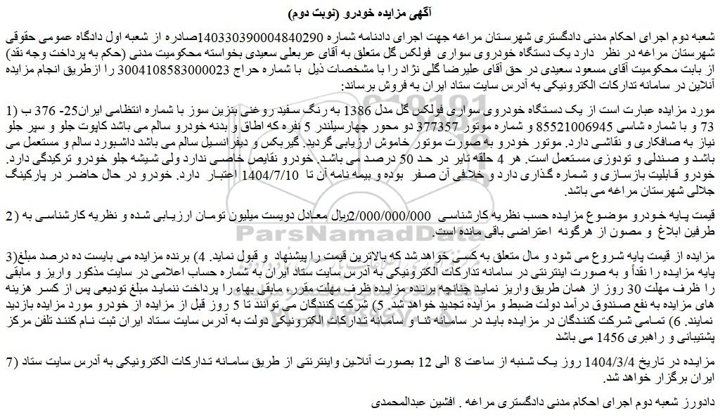 شعبه دوم اجرای احکام مدنی دادگستری شهرستان مراغه جهت اجرای دادنامه شماره 140330390004840290صادره از شعبه اول دادگاه عمومی حقوقی شهرستان مراغه در نظر دارد یک دستگاه خودروی سواری فولکس گل متعلق به آقای عربعلی سعیدی بخواسته محکومیت مدنی (حکم به پرداخت وجه نقد) از بابت محکومیت آقای مسعود سعیدی در حق آقای علیرضا گلی نژاد را با مشخصات ذیل با شماره حراج 3004108583000023 را ازطریق انجام مزایده آنلاین در سامانه تدارکات الکترونیکی به آدرس سایت ستاد ایران به فروش برساند: