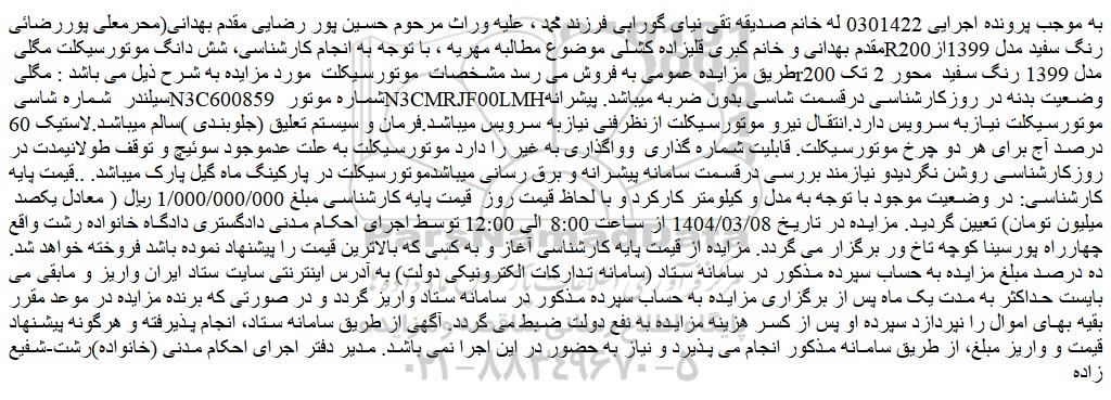 به موجب پرونده اجرایی 0301422 له خانم صدیقه تقی نیای گورابی فرزند محمد ، علیه وراث مرحوم حسین پور رضایی مقدم بهدانی(محرمعلی پوررضائی مقدم بهدانی و خانم کبری قلیزاده کشلی موضوع مطالبه مهریه ، با توجه به انجام کارشناسی، شش دانگ موتورسیکلت مگلی R200رنگ سفید مدل 1399از طریق مزایده عمومی به فروش می رسد مشخصات موتورسیکلت مورد مزایده به شرح ذیل می باشد : مگلی r200 مدل 1399 رنگ سفید محور 2 تک سیلندر شماره شاسی N3C600859 شماره موتور N3CMRJF00LMHوضعیت بدنه در روزکارشناسی درقسمت شاسی بدون ضربه میباشد. پیشرانه موتورسیکلت نیازبه سرویس دارد.انتقال نیرو موتورسیکلت ازنظرفنی نیازبه سرویس میباشد.فرمان و سیستم تعلیق (جلوبندی )سالم میباشد.لاستیک 60 درصد آج برای هر دو چرخ موتورسیکلت. قابلیت شماره گذاری وواگذاری به غیر را دارد موتورسیکلت به علت عدموجود سوئیچ و توقف طولانیمدت در روزکارشناسی روشن نگردیدو نیازمند بررسی درقسمت سامانه پیشرانه و برق رسانی میباشدموتورسیکلت در پارکینگ ماه گیل پارک میباشد. ..قیمت پایه کارشناسی: در وضعیت موجود با توجه به مدل و کیلومتر کارکرد و با لحاظ قیمت روز قیمت پایه کارشناسی مبلغ 1/000/000/000 ریال ( معادل یکصد میلیون تومان) تعیین گردید. مزایده در تاریخ 1404/03/08 از ساعت 8:00 الی 12:00 توسط اجرای احکام مدنی دادگستری دادگاه خانواده رشت واقع چهارراه پورسینا کوچه تاخ ور برگزار می گردد. مزایده از قیمت پایه کارشناسی آغاز و به کسی که بالاترین قیمت را پیشنهاد نموده باشد فروخته خواهد شد. ده درصد مبلغ مزایده به حساب سپرده مذکور در سامانه ستاد (سامانه تدارکات الکترونیکی دولت) به آدرس اینترنتی سایت ستاد ایران واریز و مابقی می بایست حداکثر به مدت یک ماه پس از برگزاری مزایده به حساب سپرده مذکور در سامانه ستاد واریز گردد و در صورتی که برنده مزایده در موعد مقرر بقیه بهای اموال را نپردازد سپرده او پس از کسر هزینه مزایده به نفع دولت ضبط می گردد. آگهی از طریق سامانه ستاد، انجام پذیرفته و هرگونه پیشنهاد قیمت و واریز مبلغ، از طریق سامانه مذکور انجام می پذیرد و نیاز به حضور در این اجرا نمی باشد. مدیر دفتر اجرای احکام مدنی (خانواده)رشت-شفیع زاده