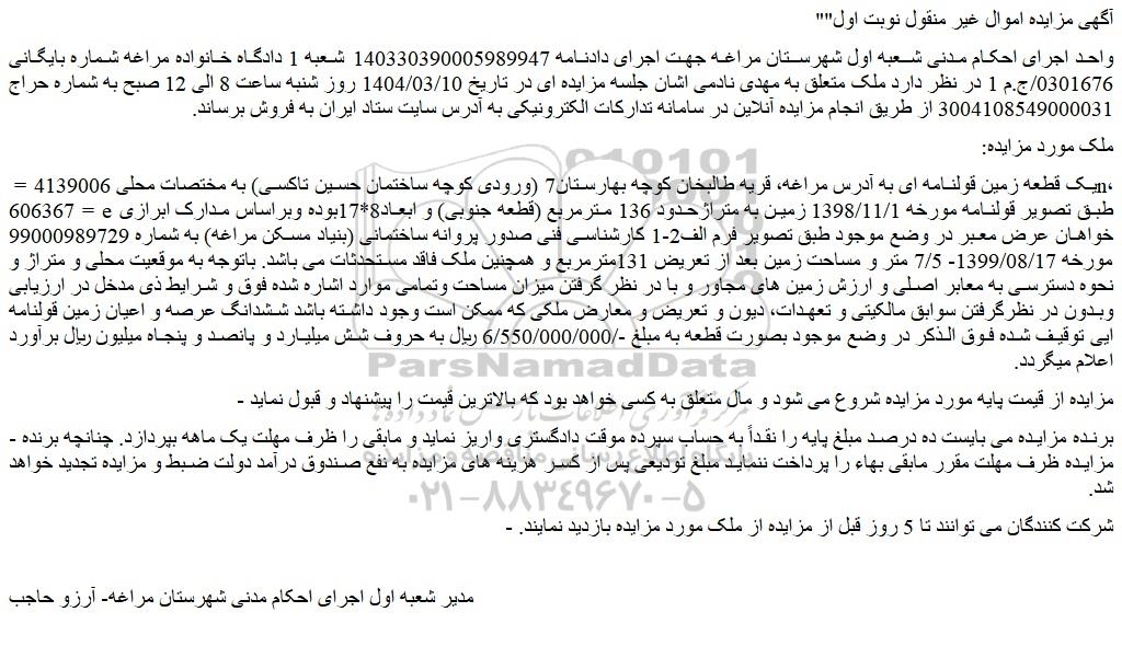 واحد اجرای احکام مدنی شعبه اول شهرستان مراغه جهت اجرای دادنامه 140330390005989947 شعبه 1 دادگاه خانواده مراغه شماره بایگانی 0301676/ج.م 1 در نظر دارد ملک متعلق به مهدی نادمی اشان جلسه مزایده ای در تاریخ 1404/03/10 روز شنبه ساعت 8 الی 12 صبح به شماره حراج 3004108549000031 از طریق انجام مزایده آنلاین در سامانه تدارکات الکترونیکی به آدرس سایت ستاد ایران به فروش برساند.