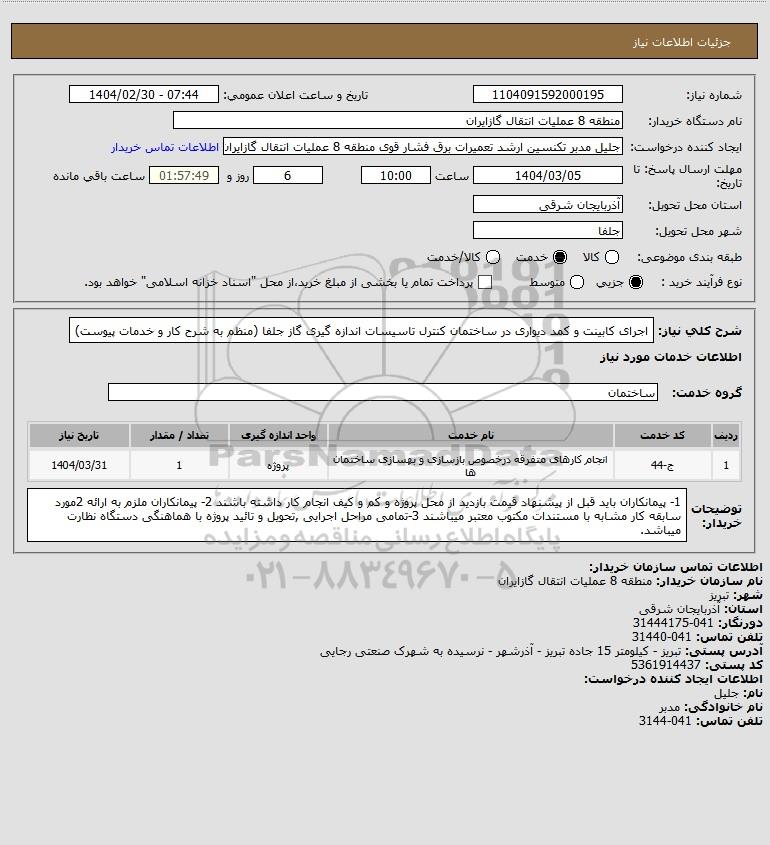 شرح کلی نیاز: اجرای کابینت و کمد دیواری در ساختمان کنترل تاسیسات اندازه گیری گاز جلفا (منظم به شرح کار و خدمات پیوست)