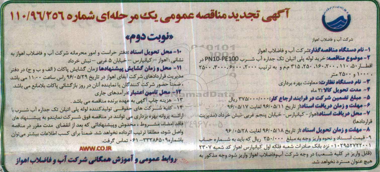 تجدید مناقصه خرید لوله پلی اتیلن تک جداره آب شرب ... - نوبت دوم از کلیه افراد متخصص و شرکتها واجد شرایط دعوت به عمل میآید در مناقصه با کد خبرگزاری پارس نماد: 905392 شرکت نمایند.