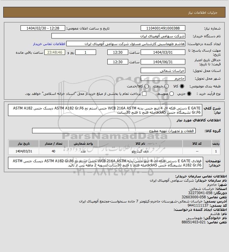 شرح کلی نیاز: E GATE دستی فلکه ای 4 اینچ جنس بدنه WCB 216A ASTM جنس استم