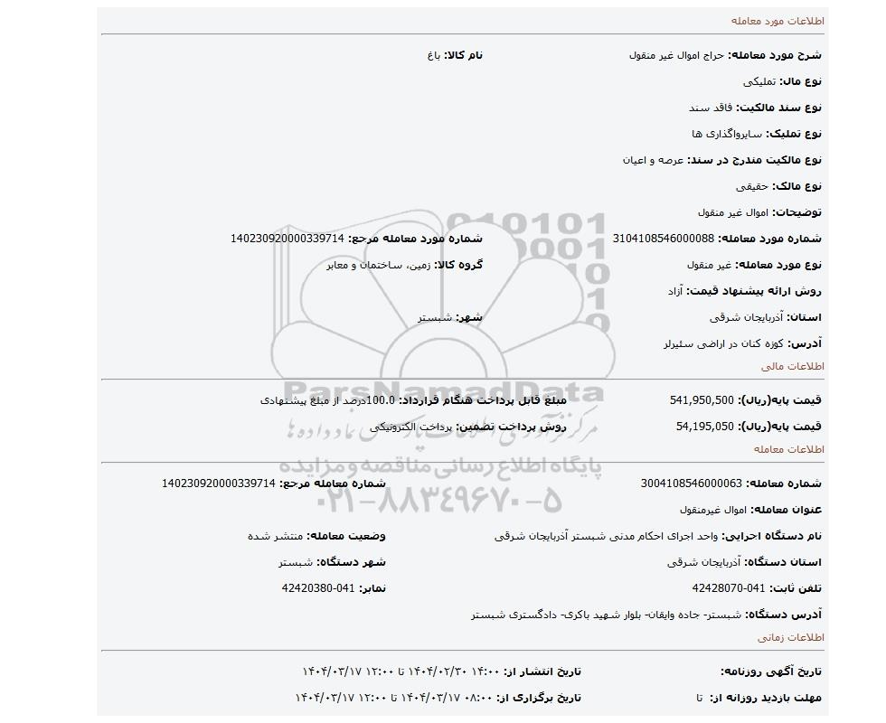 | شرح مورد معامله: حراج اموال غیر منقول | نام کالا: باغ | |