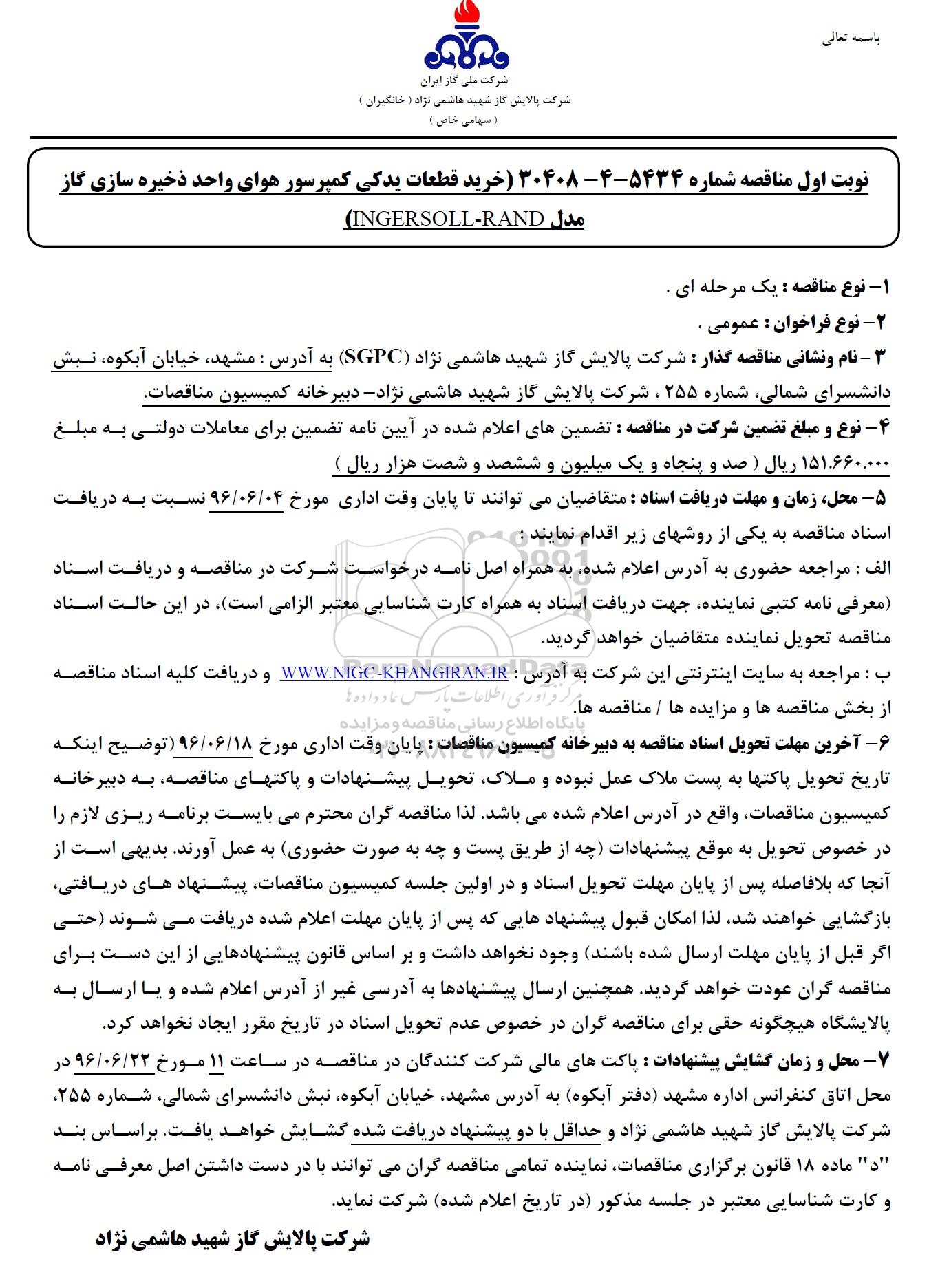 نوبت اول مناقصه شماره 5434-4-30408 (خرید قطعات یدکی کمپرسور هوای واحد ذخیره سازی گاز مدل INGERSOLL-RAND)