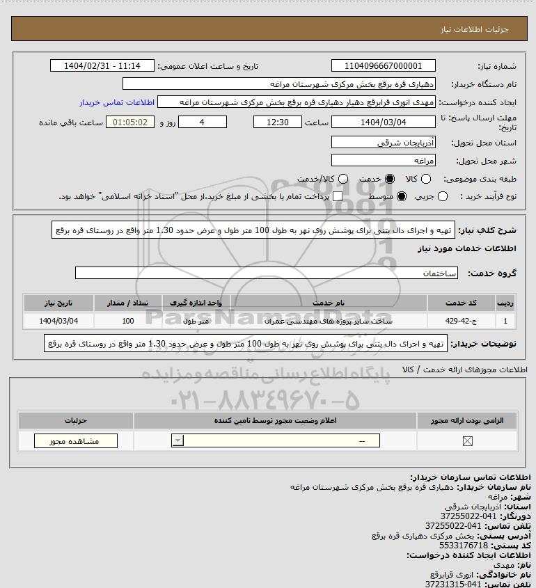 شرح کلی نیاز: تهیه و اجرای دال بتنی برای پوشش روی نهر به طول 100 متر طول و عرض حدود 1.30 متر واقع در روستای قره برقع