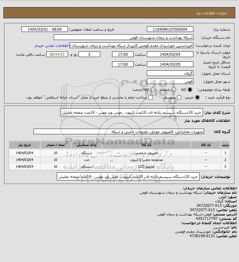 شرح کلی نیاز: خرید 10دستگاه سیستم رایانه ای. 10عدد کیبورد . موس وپد موس - 10عدد صفحه نمایش