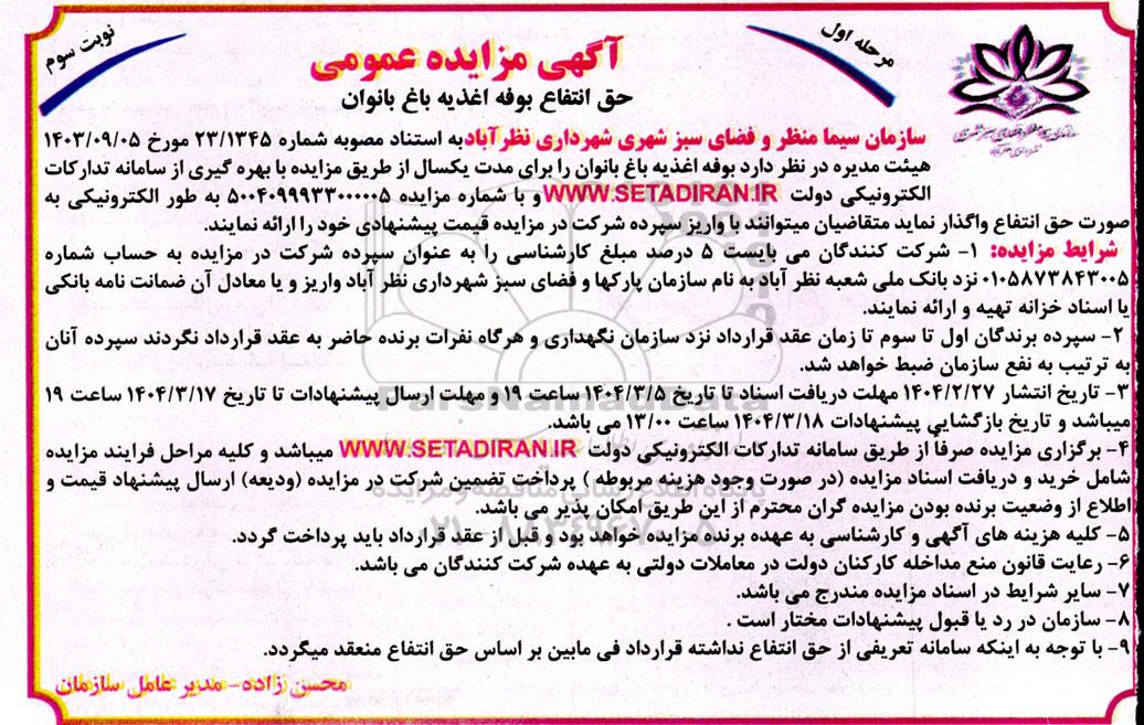 سازمان سیما منظر و فضای سبز شهری شهرداری نظر آباد به استناد مصوبه شماره 23/1345 مورخ 1403.09.05 هیئت مدیره در نظر دارد بوفه اغذیه باغ بانوان را برای مدت یکسال از طریق مزایده با بهره گیری از سامانه و با شماره مزایده 5004099933000005 به طور الکترونیکی به صورت حق انتفاع واگذار نماید. متقاضیان می توانند با واریز سپرده شرکت در مزایده قیمت پیشنهادی خود را ارائه نمایند.