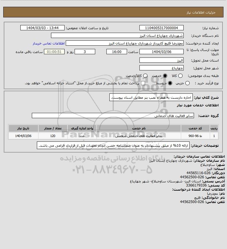 شرح کلی نیاز: اجاره داربست به همراه نصب بنر مطابق اسناد پیوست.