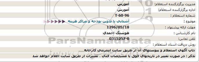 استعلام بها و موضوع استعلام استعلام آشنایی با تدوین بودجه و مراکز هزینه به اطلاع کلیه شرکتها و افراد متخصص واجد شرایط میرساند، آگهی گذار در نظر دارد از طریق استعلام بها، نسبت به انتخاب و دریافت پیشنهادات اقدام نماید. این استعلام با کد آگهی ثبت شده در سامانه خبرگزاری پارس نماد : 907548 منتشر شده است. مشخصات استعلام : تاریخ شروع استعلام: 1396/05/16 آخرین مهلت ارسال پیشنهاد قیمت : 1396/05/18 و محل اجرای پروژه : استان اصفهان میباشد. استعلام قیمت مورد درخواست : استعلام آشنایی با تدوین بودجه و مراکز هزینه با دستهبندیهای تخصصی و گروه های مرتبط : مشاوره تحقیقات و مدیریت استاندارد, حسابداری و خدمات مالی, استعلام اطلاع رسانی میگردد.
