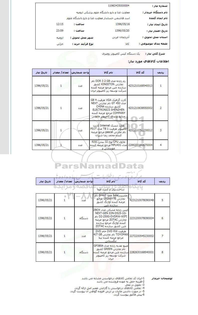 | 2 | 4231210638550002 | کارت گرافیکی VGA ظرفت 4 GB مدل GT 450 نام تجارتی NEXT کشور سازنده CHINA ELECTRONICS SHENZHEN COMPANY مرجع عرضه کننده صنایع تولیدی کامپیوتر طاووس | عدد | 1 | 96.5.21 |