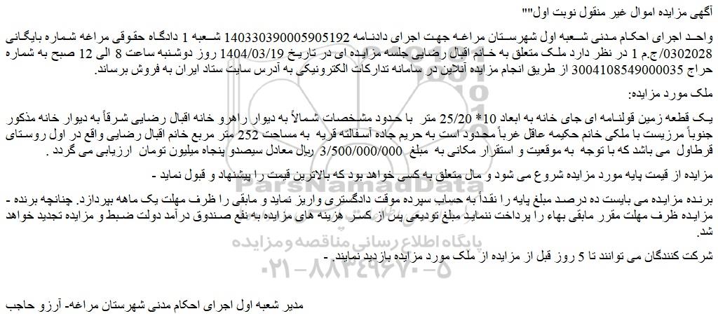 واحد اجرای احکام مدنی شعبه اول شهرستان مراغه جهت اجرای دادنامه 140330390005905192 شعبه 1 دادگاه حقوقی مراغه شماره بایگانی 0302028/ج.م 1 در نظر دارد ملک متعلق به خانم اقبال رضایی جلسه مزایده ای در تاریخ 1404/03/19 روز دوشنبه ساعت 8 الی 12 صبح به شماره حراج 3004108549000035 از طریق انجام مزایده آنلاین در سامانه تدارکات الکترونیکی به آدرس سایت ستاد ایران به فروش برساند.